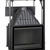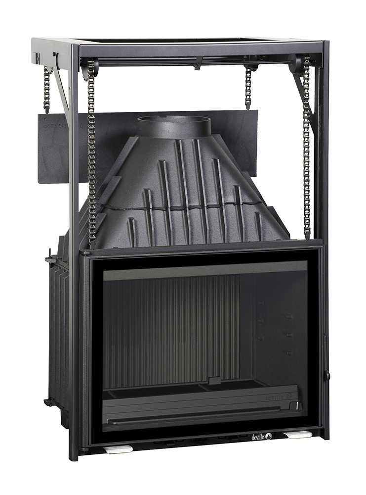 La porte s’ouvre et se ferme latéralement pour obtenir les meilleures performances énergétiques de votre foyer fermé. Elle coulisse également en hauteur par un système de contrepoids. Cette porte relevable vous permet ainsi de profiter occasionnellement d’une flambée à l’âtre.